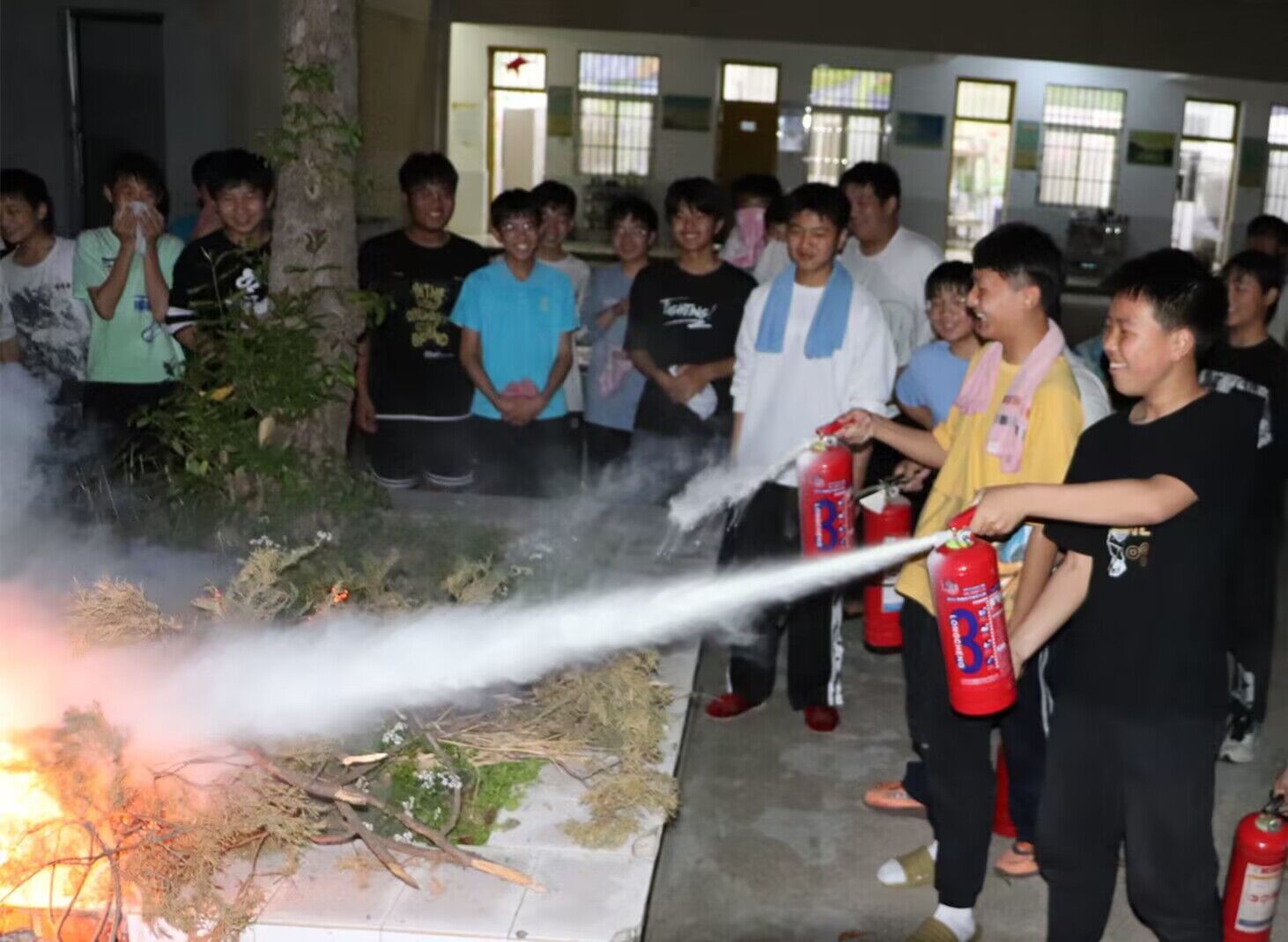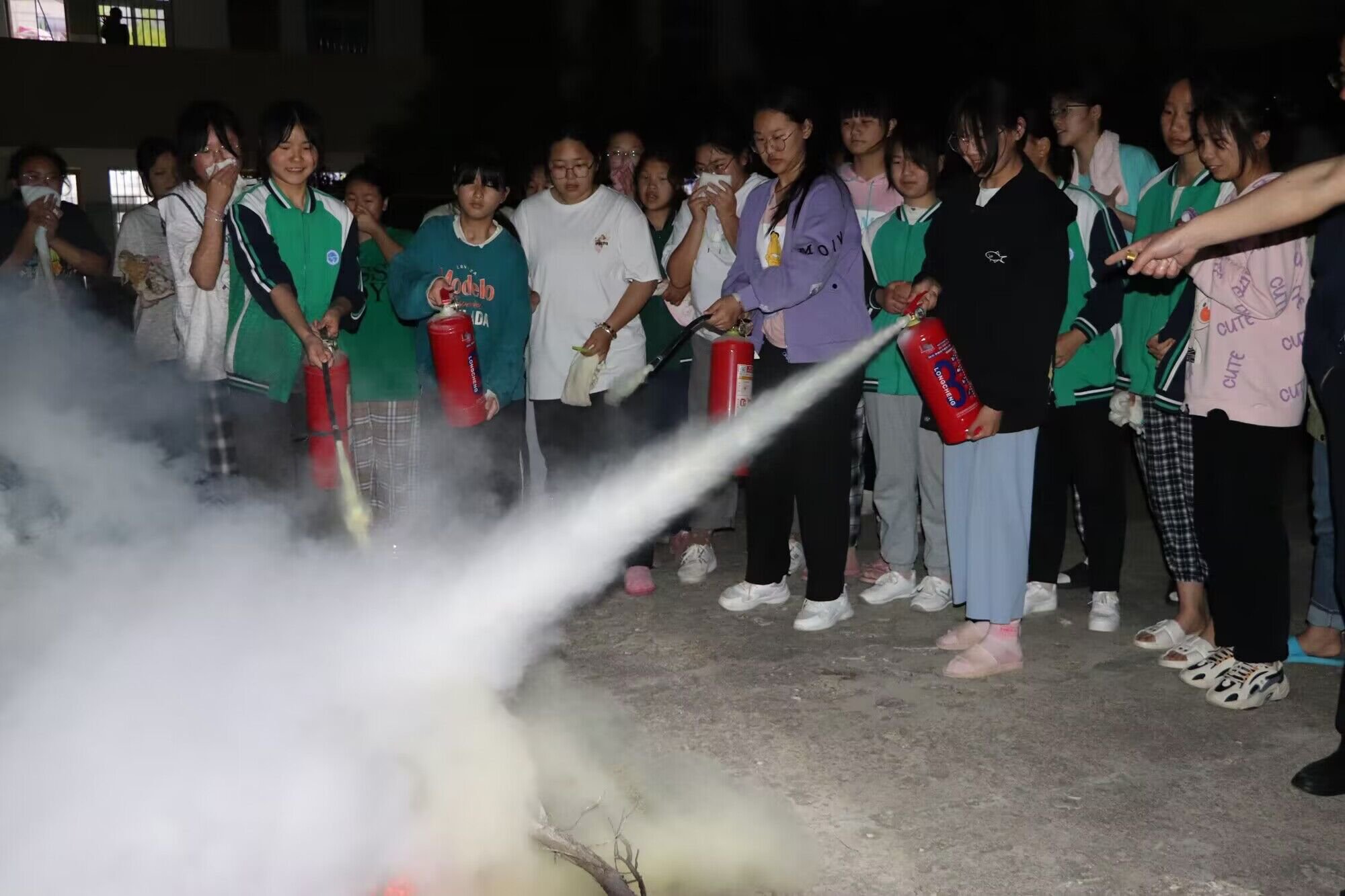 清点人数后,安全办主任就灭火器正确使用方法和注意事项进行细致讲解。并示范了灭火器操作程序。随后,同学们现场体验了灭火过程。