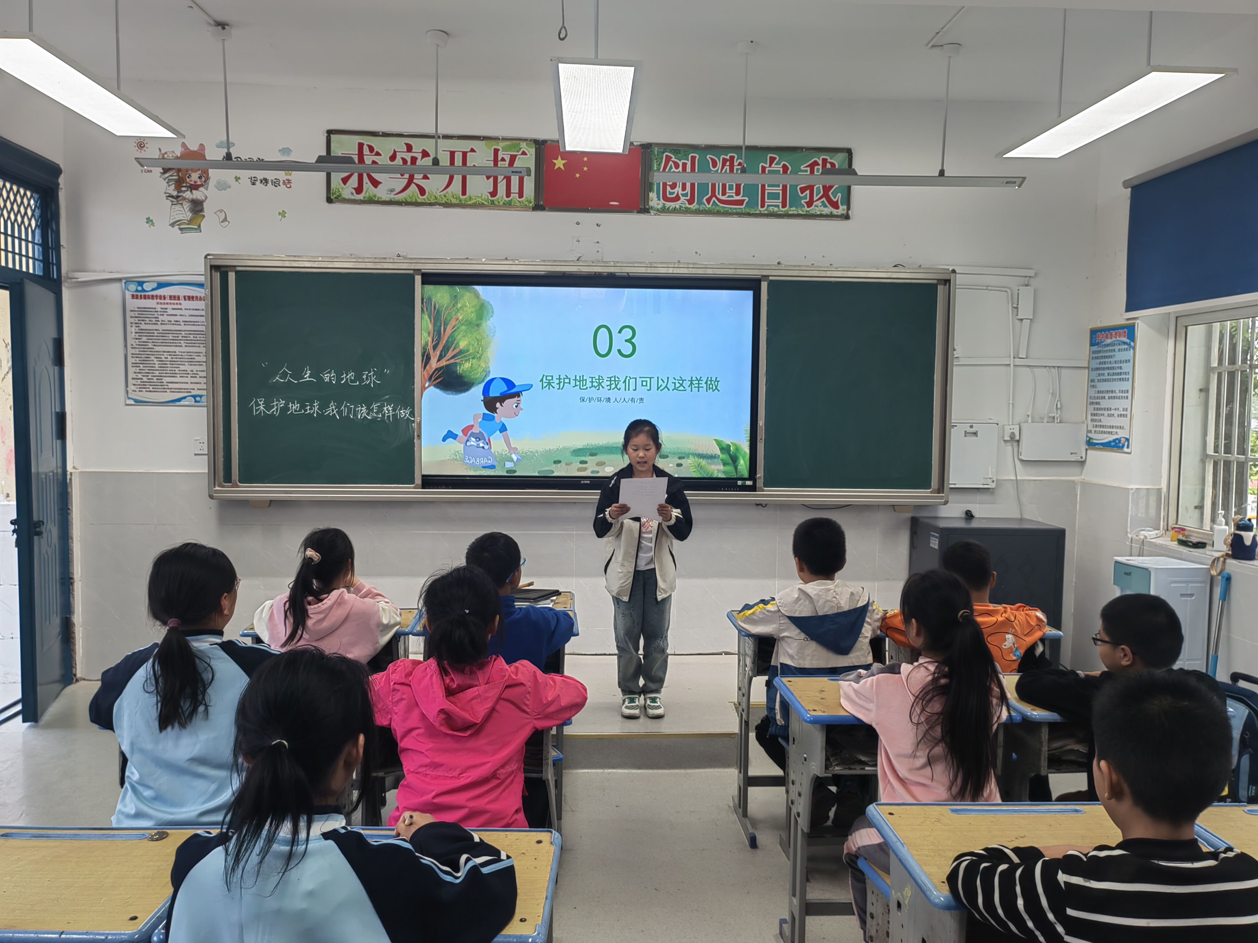 ~    学校统一组织各班召开“世界地球日”主题班会,老师们利用课件,以视频、图片、文字等形式,介绍“地球日的由来、认识我们的地球、了解地球的现状及保护地球的重要性”等知识内容,班会课上还让学生谈谈心里话:“保护地球,我们应该怎样做”,引导同学们从小树立保护地球的意识,美丽家园需要大家共同来呵护。学校还利用电子显示屏滚动播放世界地球日宣传标语,引导学生爱护花草树木,节约用水用电,垃圾分类,向学生宣传保护地球的重要性。