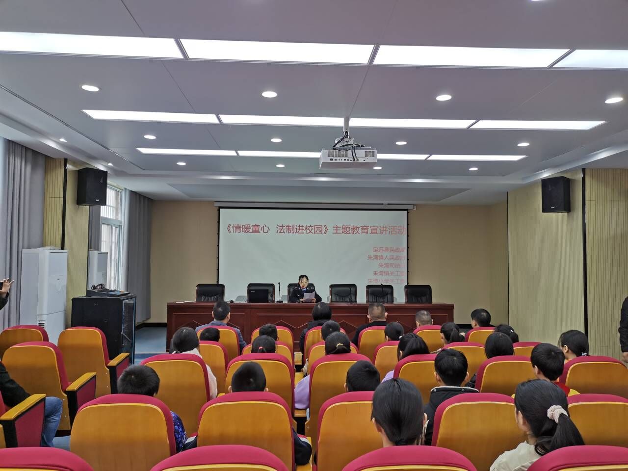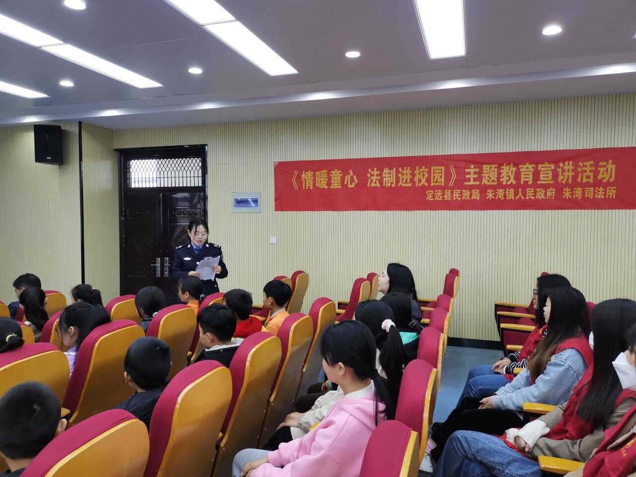 ~ 定远县民政局及朱湾镇党委领导、该校校长分别讲话,鼓励孩子们自立自强,刻苦学习,努力成为国之栋梁。并现场发放台灯水杯等礼品,让孩子们感到温暖。随后朱湾镇司法所开展“情暖童心,法制进校园”主题宣讲,引导孩子们学会用法律武器保护自己,安全健康成长。