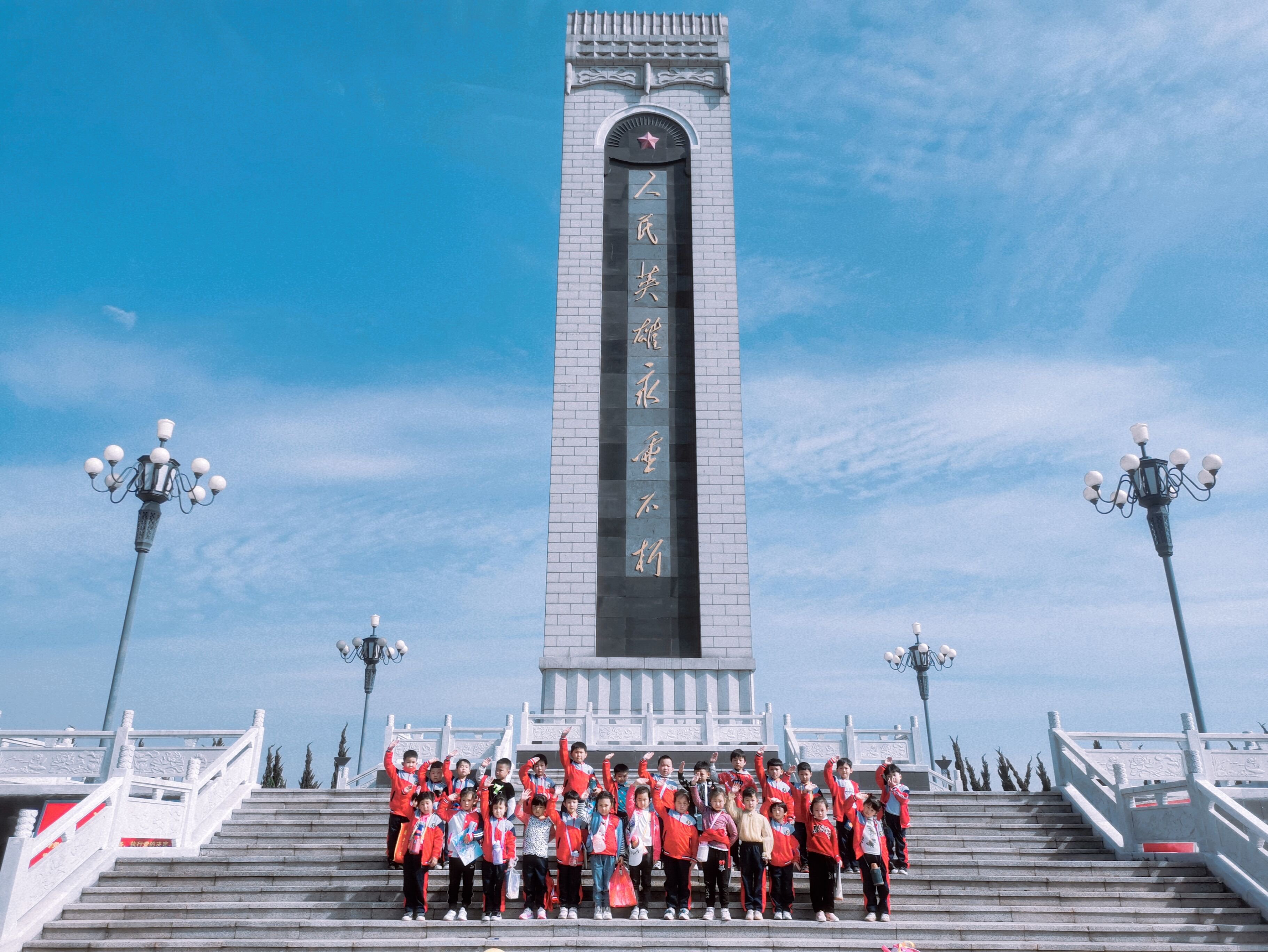 当天,全体师幼排着整齐的队伍,来到藕塘烈士陵园,开展了共唱国歌、齐诵经典童谣、瞻仰人民英雄纪念碑、向革命烈士默哀等活动。浓厚的氛围激发了幼儿对革命先烈的崇敬与缅怀之情,让幼儿懂得幸福生活来之不易,要珍惜生命、热爱生活、热爱祖国。