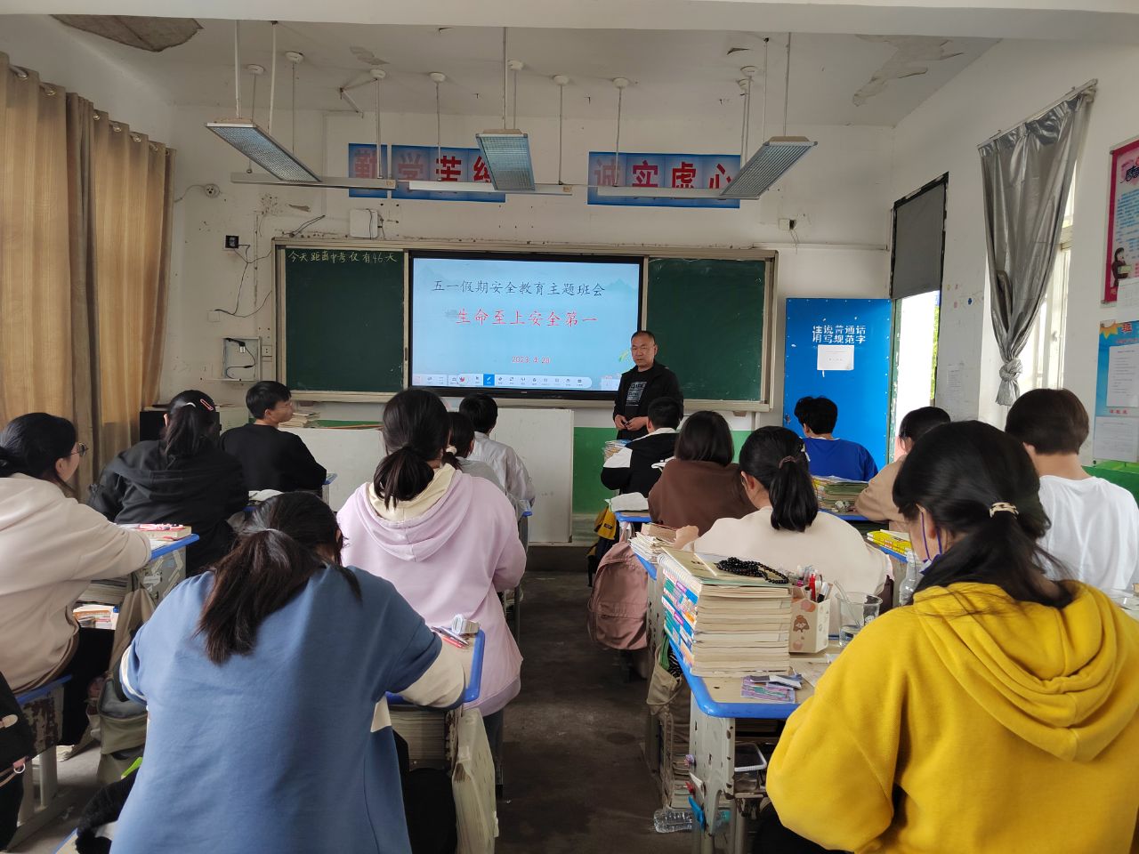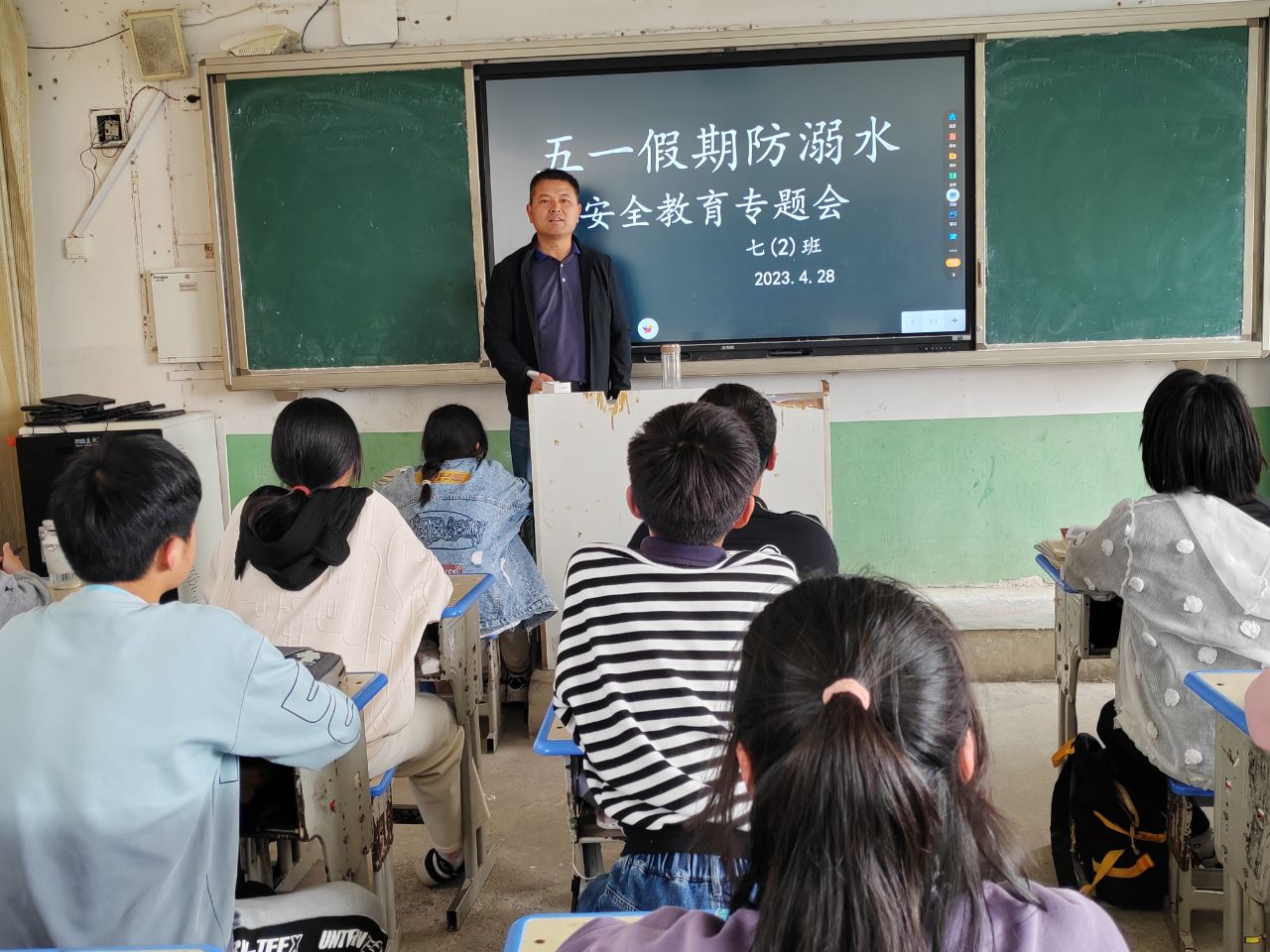 ~ 2023年4月28日下午,各班级根据学校要求,召开“防溺水”安全教育主题班会。该校以班级为单位,组织学生集中观看《防溺水安全警示片》,确保不漏一个学生;班主任以“防溺水”安全教育为重点,宣传“防溺水”安全教育常识以及生命防护意义,警示学生,如何保护自身安全。此前,该校已经召开“防溺水”安全教育家长会,通过家校联合,共同监管学生,确保安全。班会上,班主任还强调了“交通安全”“用火用电安全”“网络安全”等,期望学生过一个“安全”的“五一”。分包“防溺水安全教育”的教师,利用课间时间,对学生进行安全教育,强化学生安全意识。