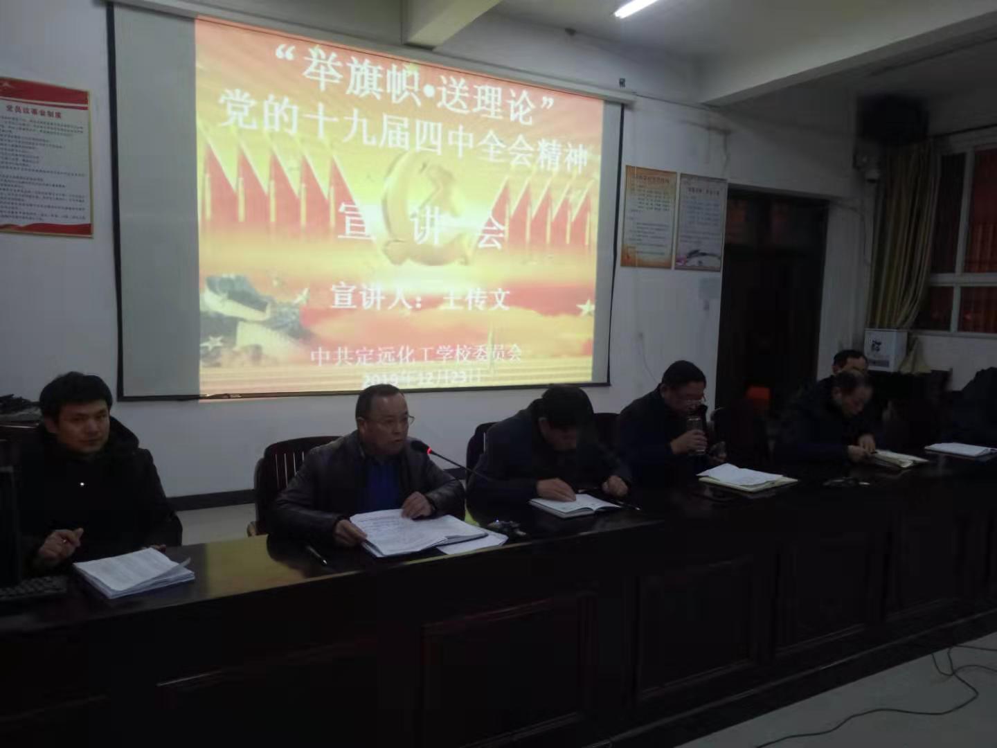 12月23 日,定远化工学校在综合楼一楼会议室举行专题宣讲报告会。校党委委员、副校长王传文做学习宣传贯彻党的十九届四中全会精神的专题宣讲。会议由校党委书记、校长周世东主...