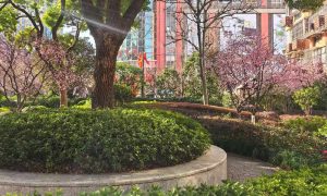 文~图/一喜 小圃花开绿映红,老树攀枝楼影中。莫叹街园游不值,人生境界有几重?