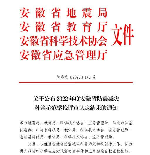 近日,安徽省地震局、安徽省教育厅、安徽省科学技术协会、安徽省应急管理厅联合发文, 公布了2022年度安徽省防震减灾科普示范学校评审认定结果的名单,定远县新区实验小学榜上有名。 该校...