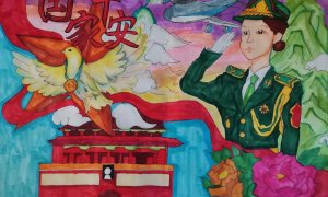 《国家平安人民幸福》 作者:建设小学六(5)班 盛可馨 指导老师:徐再慧 创意说明: 天安门屹立东方,白鸽衔来和平枝,战机列阵...