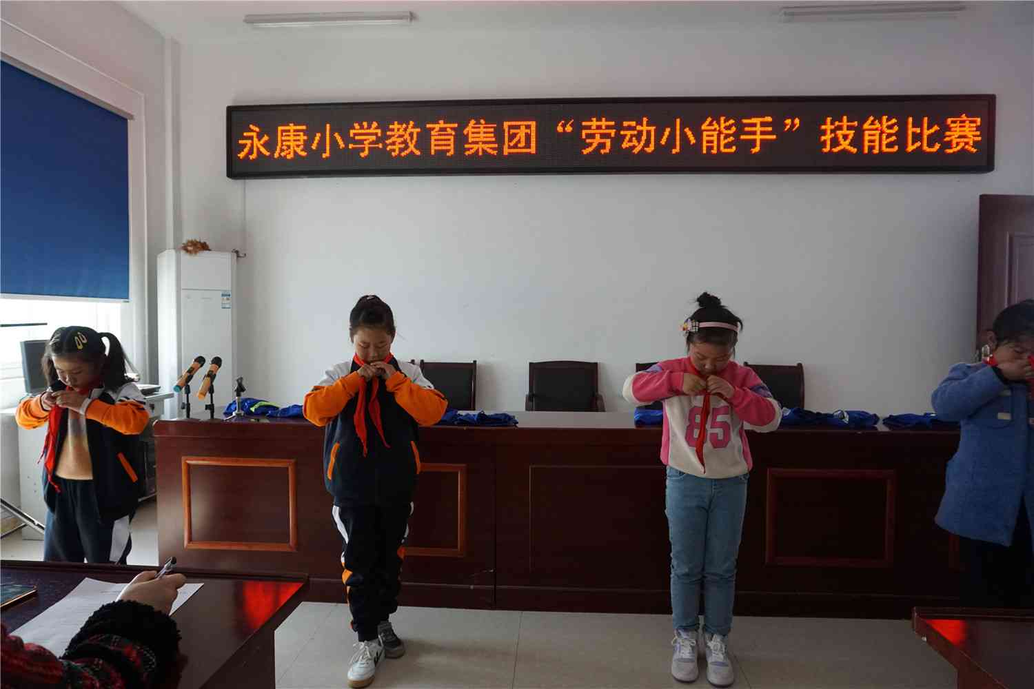 ~ 4月28日上午,定远县永康小学教育集团的会议室传来一片欢声笑语,原来是少先队员们正在进行“我是小能手”技能比赛,此次参赛的为一二年级组少先队员,比赛内容分为系鞋带、系红领巾、叠...